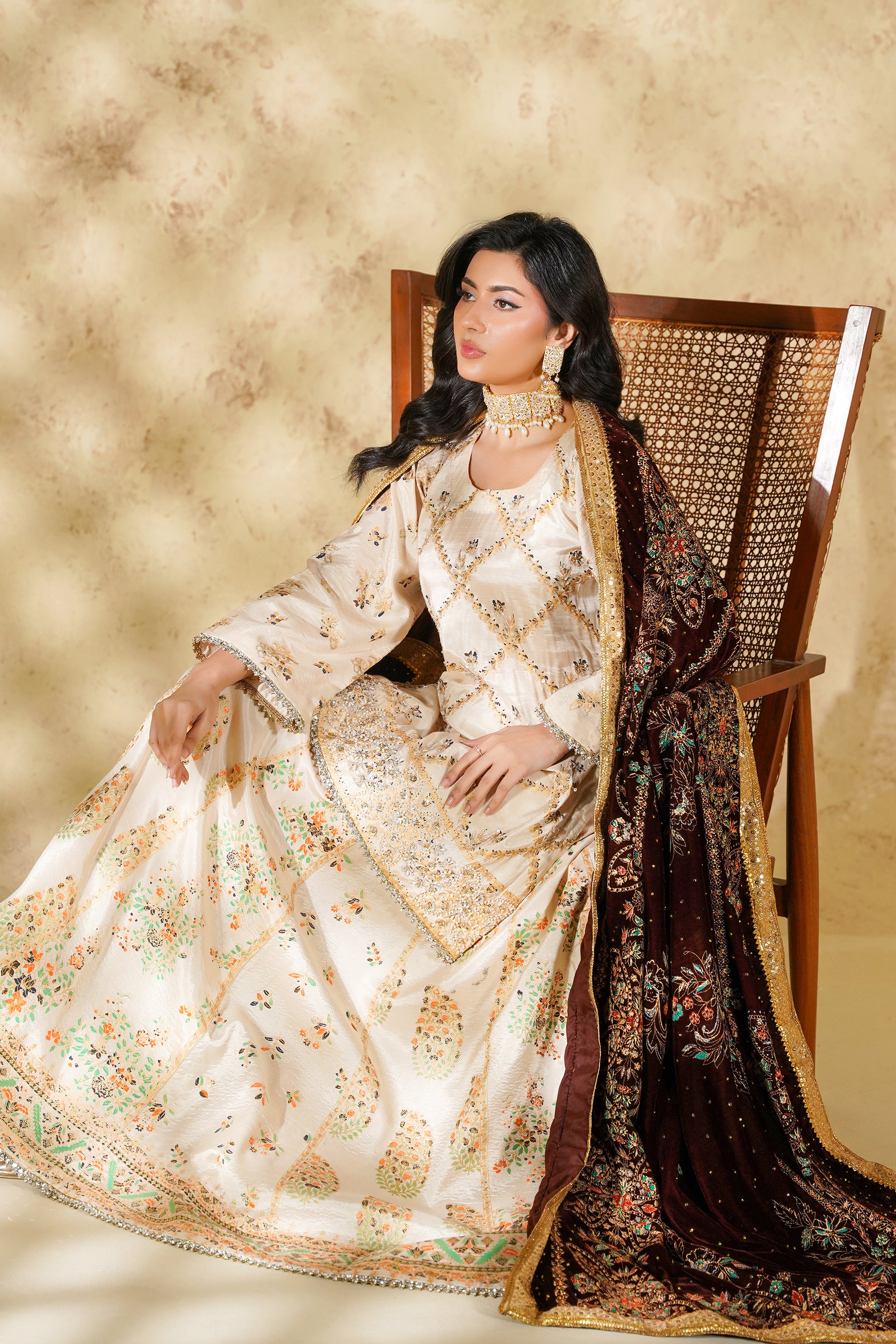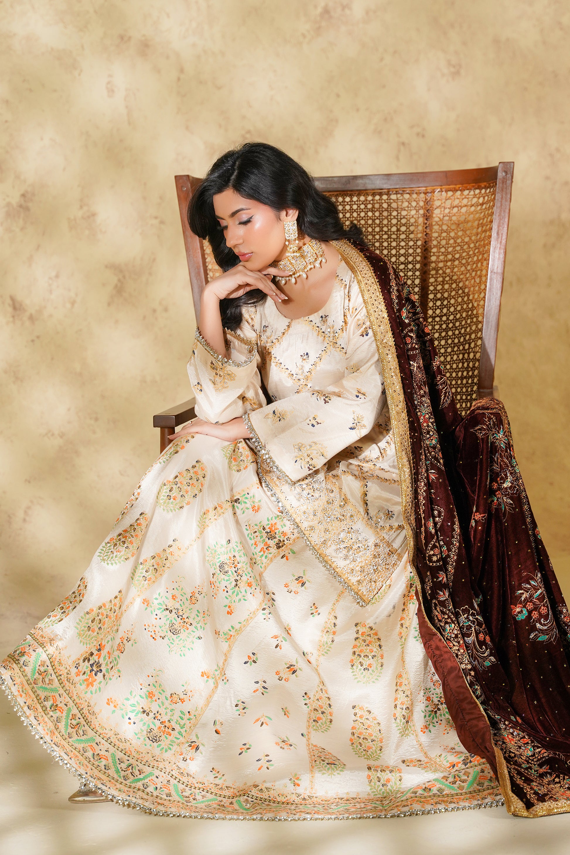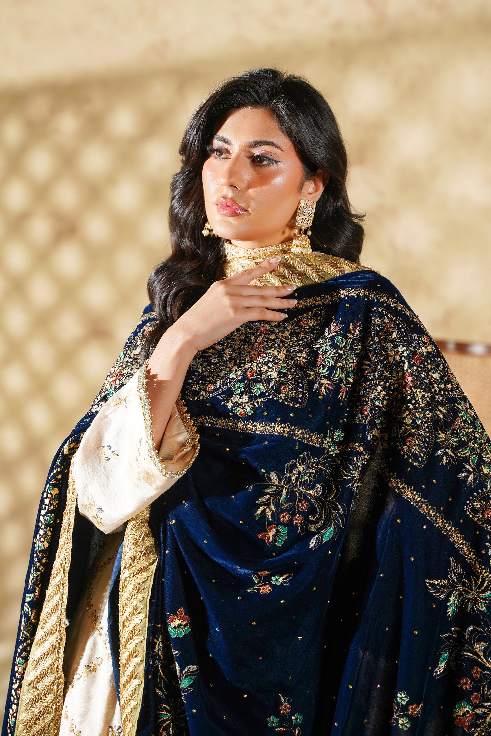 This unstitched designer suit set is crafted with fine raw silk and velvet fabrics, showcasing intricate hand block prints and handcrafted detailing. The combination of textures, traditional artistry, and rich colors makes it ideal for formal gatherings, weddings, and festive occasions.
