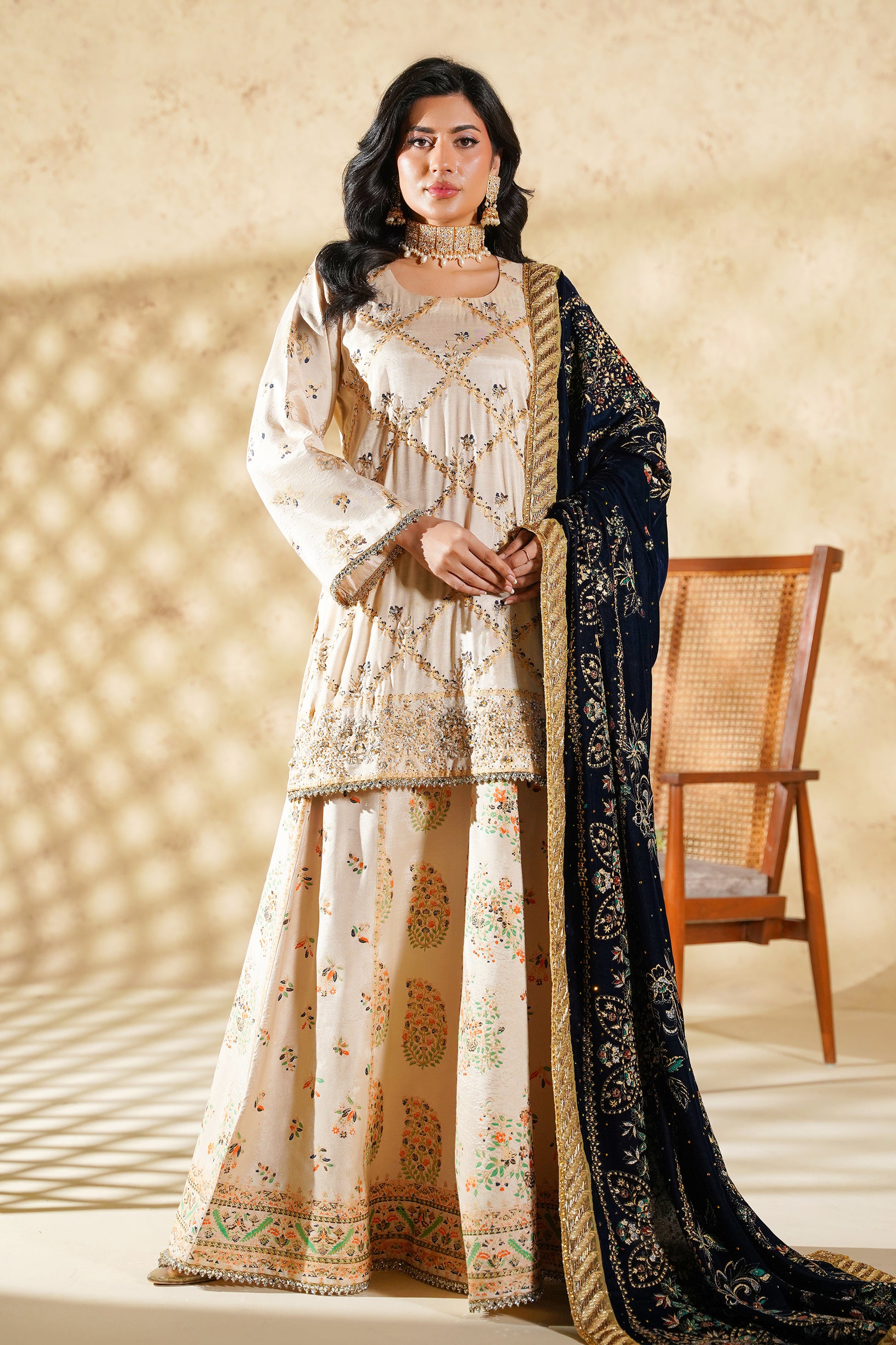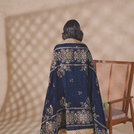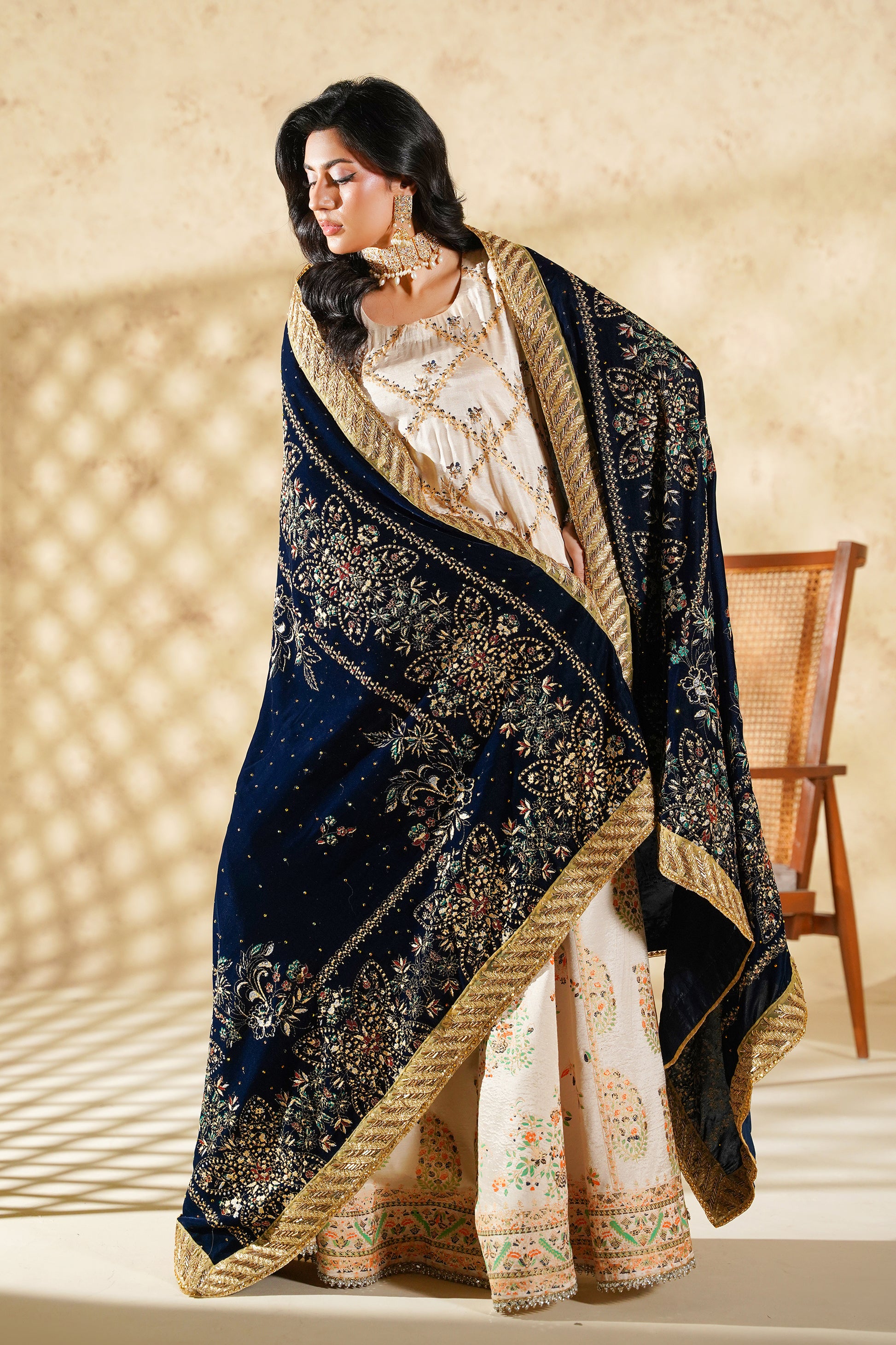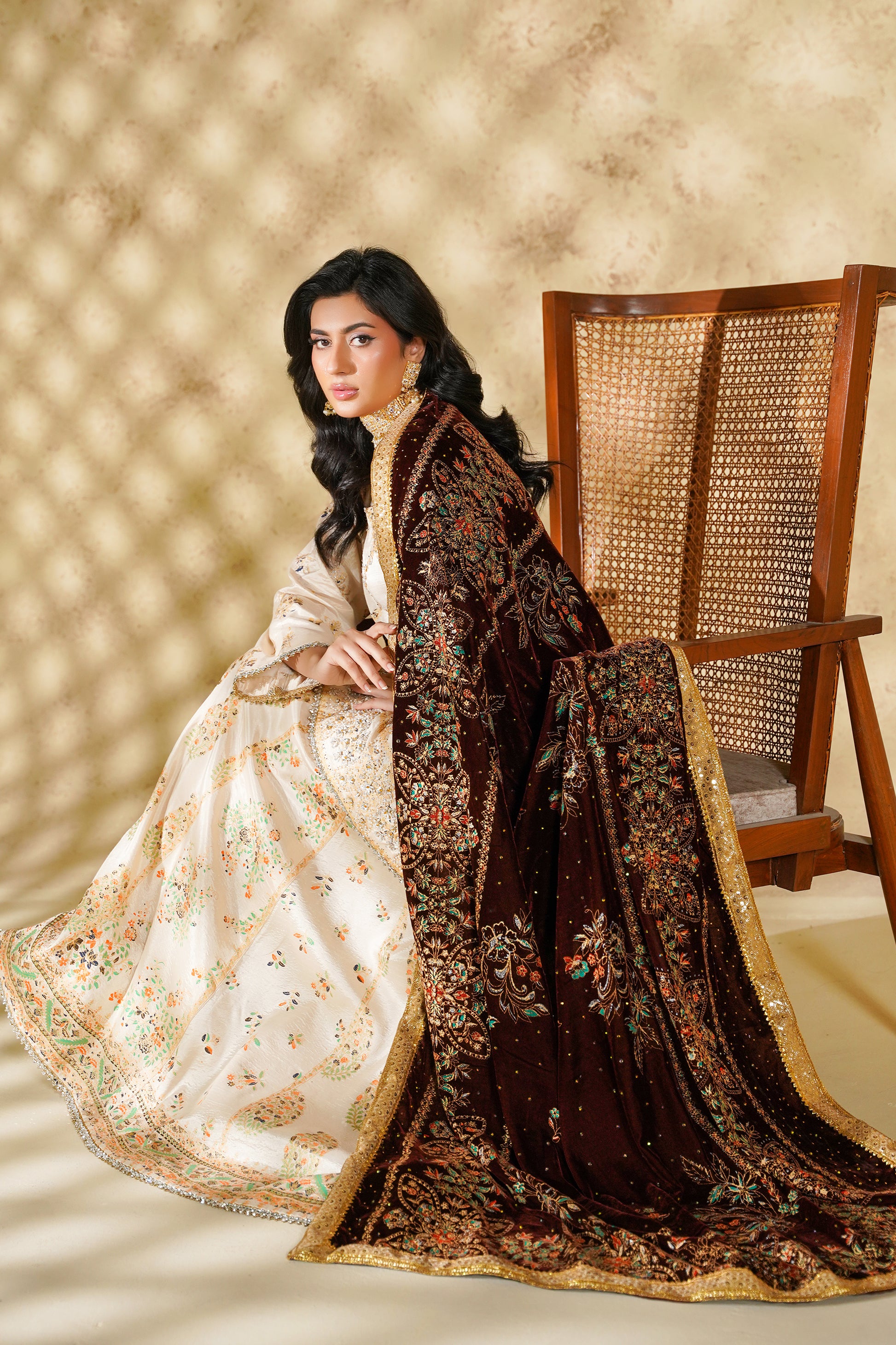 This unstitched designer suit set is crafted with fine raw silk and velvet fabrics, showcasing intricate hand block prints and handcrafted detailing. The combination of textures, traditional artistry, and rich colors makes it ideal for formal gatherings, weddings, and festive occasions.