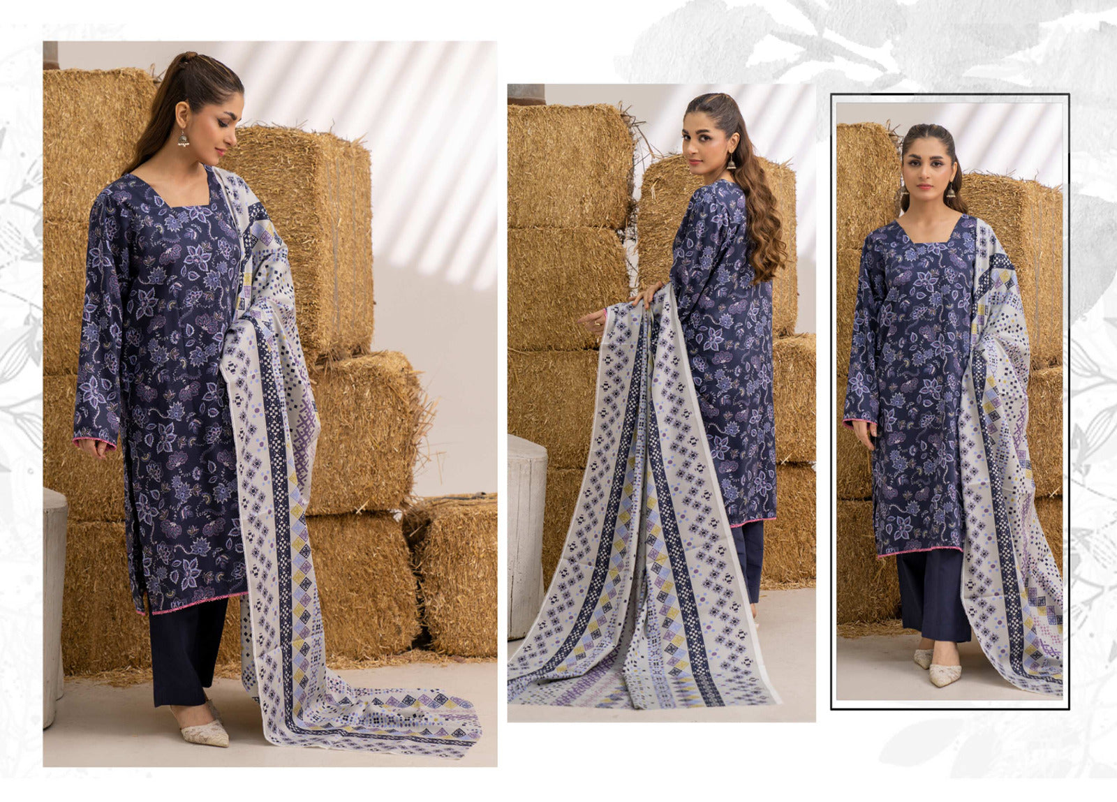 Deep Navy Floral Printed Khaddar 3-Piece Unstitched Suit